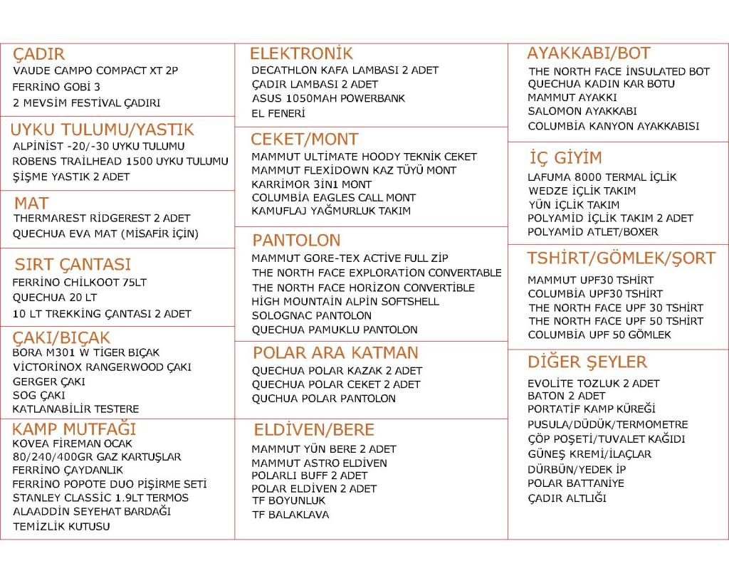 Kendi ekipman listemi aşağıda görselde sizlerle paylaşabilirim,ihtiyacım oldukça yeni ürünler alıp ekipmanlarımı güncellemeye çalışıyorum. Yapacağım faaliyete göre listemden seçtiklerimle sırt çantamın içini dolduruyorum.