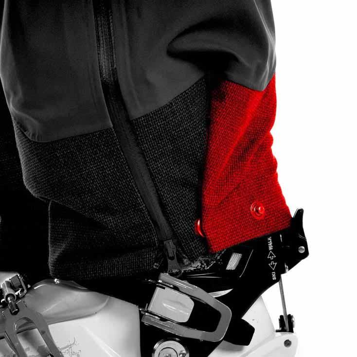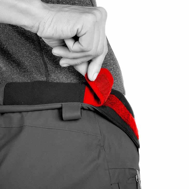 Paça ve bacak genişliğini ayarlamak için iki kademe perçinli düğme var, daha iyi bot ve krampon uyumu için bu detayı da atlamamışlar. Paça içi tozluklarda cırt bantla ayarlanabiliyor.Paça kısmı aşınmaya dayanıklı sert dokulu kevlar bileşenli bir kumaşla güçlendirilmiş.