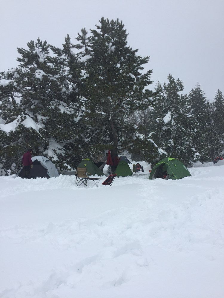 Çadırımı ağaç altı olmayan düz bir alana zemindeki karı ezip kurduk, fotoğraftaki gibi kar yükü taşıyan ağaçların altına çadır kuranlar gece ağaçtan düşen kar gürültüleriyle pek rahat uyuyamadılar.