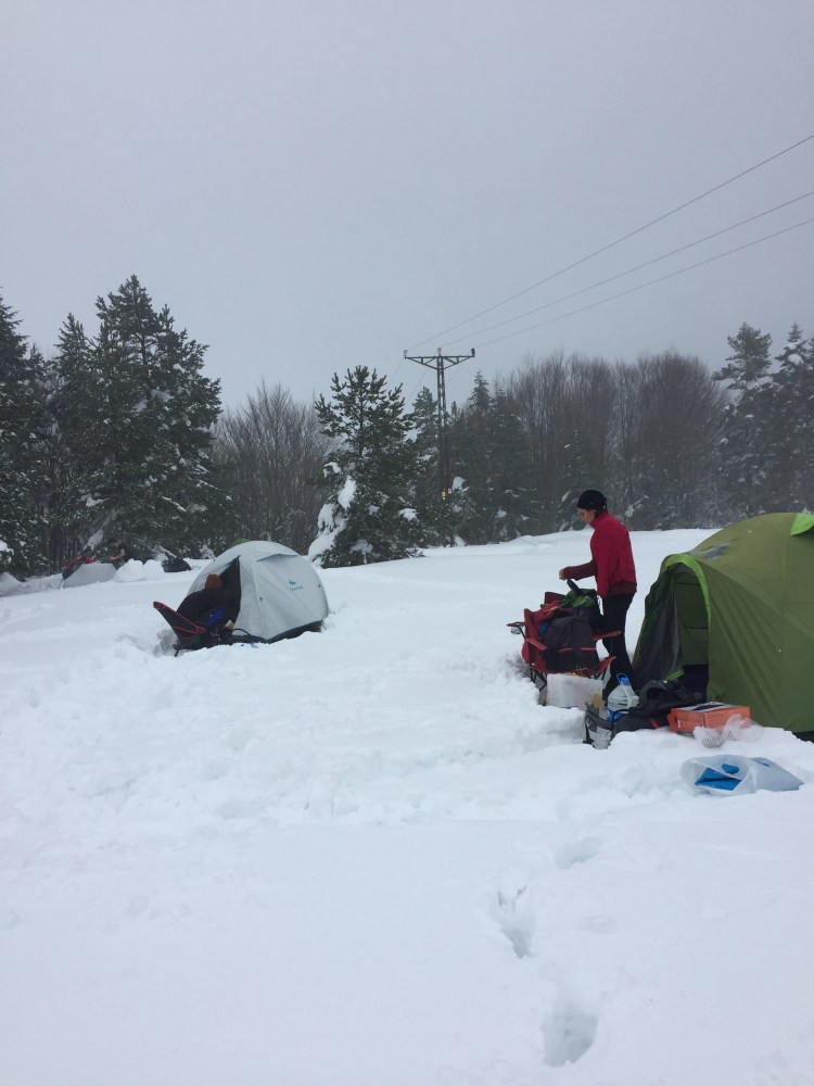 Zeminde kar kar kalınlığı 1 metre civarında olduğu için karı küremeye uğraşmak kötü bir fikirdi, sadece çadırın bagaj bölümünü 50 cm kadar kazdık. Böylece çadıra giriş çıkışlar kolaylaştı ve bagaj bölümünde ocak yaktığımızda ateş rüzgardan etkilenmemiş oldu.